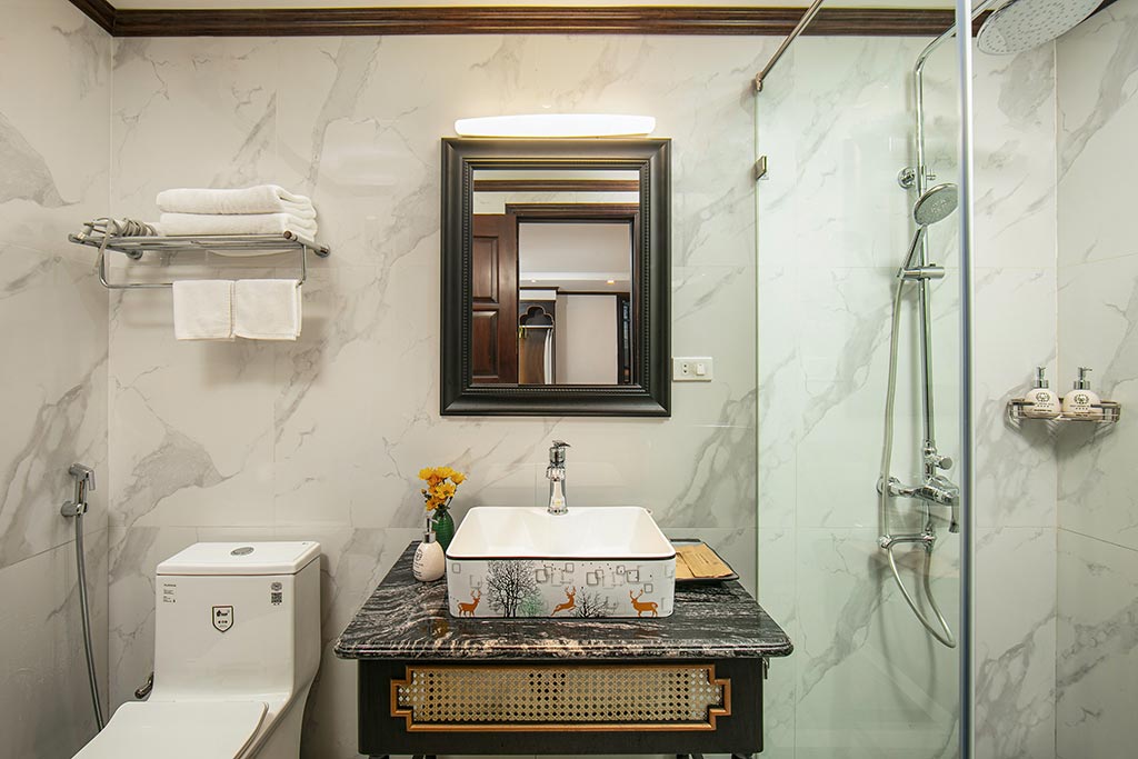 - a full set of towels (hand towel, bath towel, face towel, and bath mat).