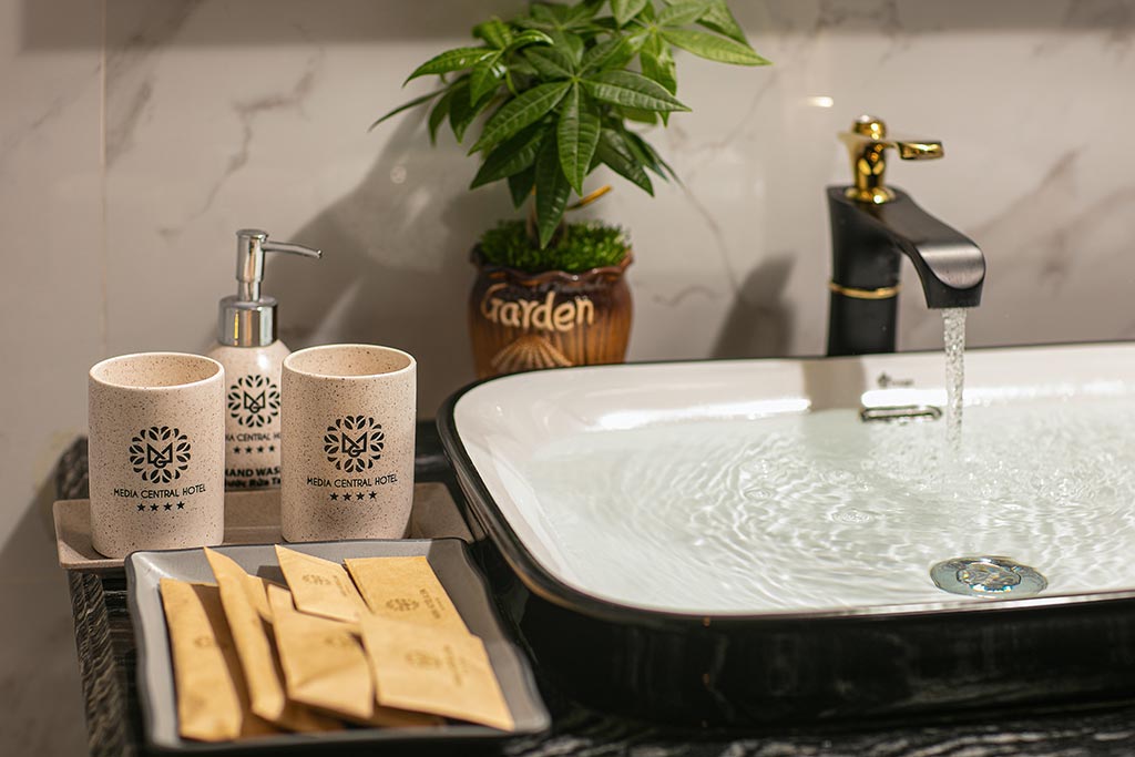 Bath amenities set (body wash, shampoo, hand soap), toiletries (toothbrush