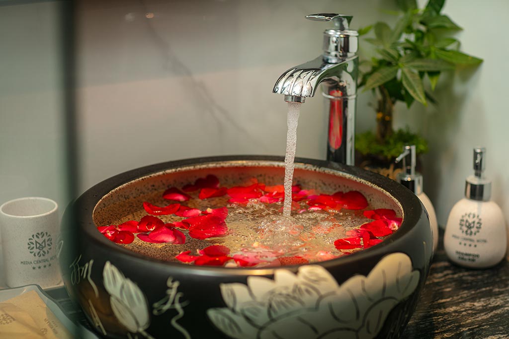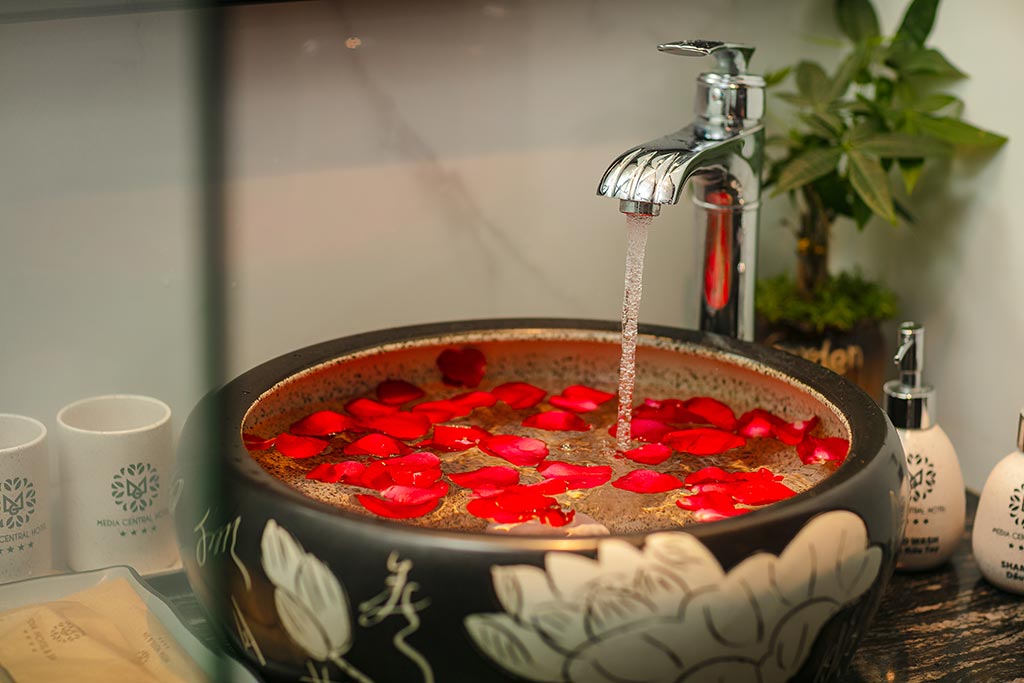 - a full set of towels (hand towel, bath towel, face towel, and bath mat).